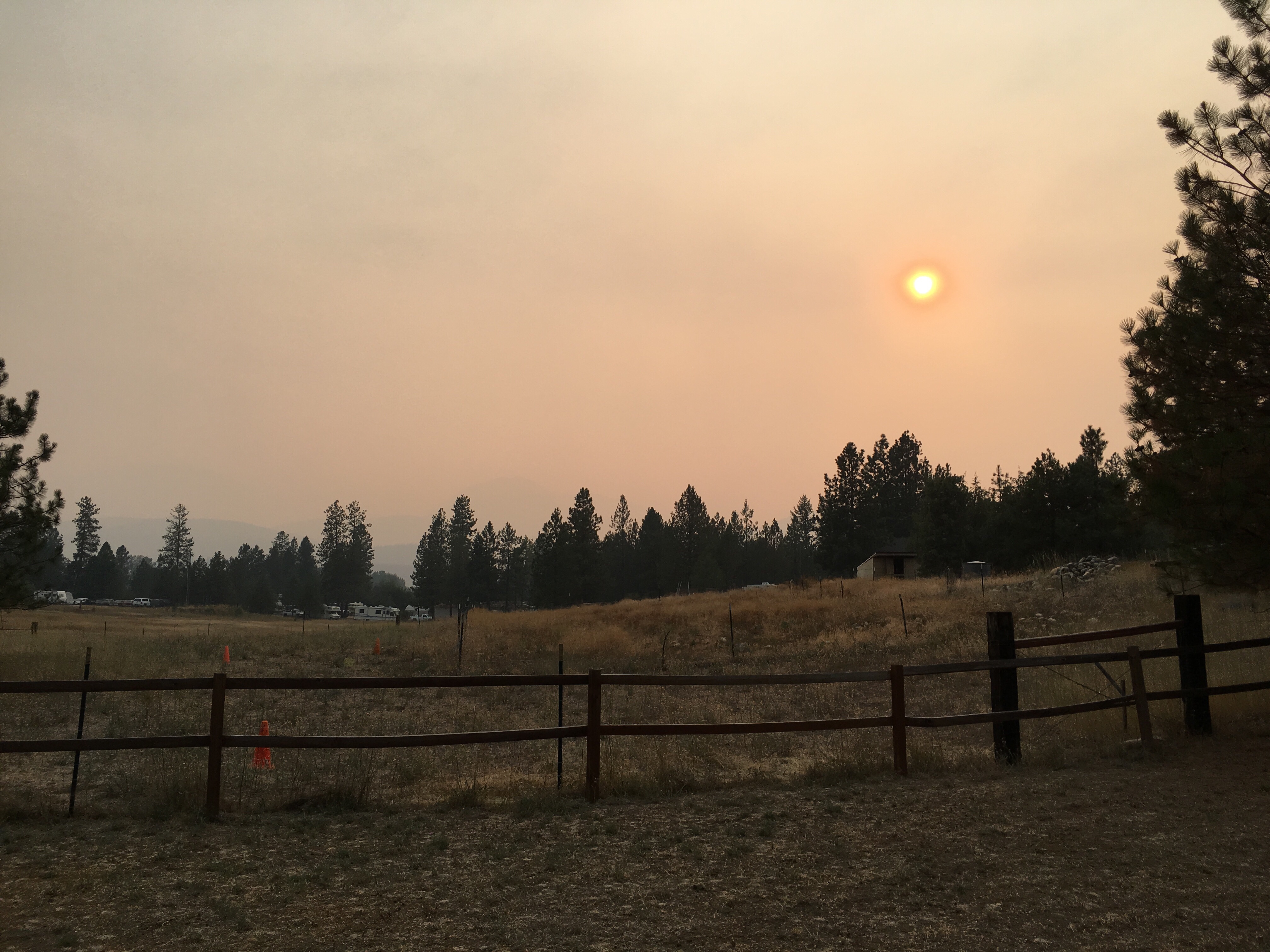 Gegen 16 Uhr, nahe Libby wurde der Rauch immer dichter. Die Nase ist augenblicklich verstopft, der brennt in den Augen und ich könnte schwören, dass Montana gar keine Berge hat. Vor lauter Qualm kann mann kaum die nächste Anhöhe sehen. Kurz bevor wir vom Highway 2 in unsere Siedlung abbiegen sind 2 zusätzliche Feuercamps ausgeschildert. Kein gutes Zeichen. In Galcier Park brennen nach heutigen Angaben über 11.000 Acer. Keine 13 Meilen von uns ist ein Brand noch nicht unter Kontrolle.